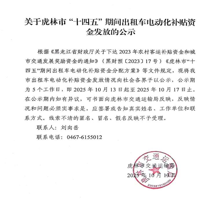 关于虎林市“十四五”期间出租车电动化补贴资金发放的公示
