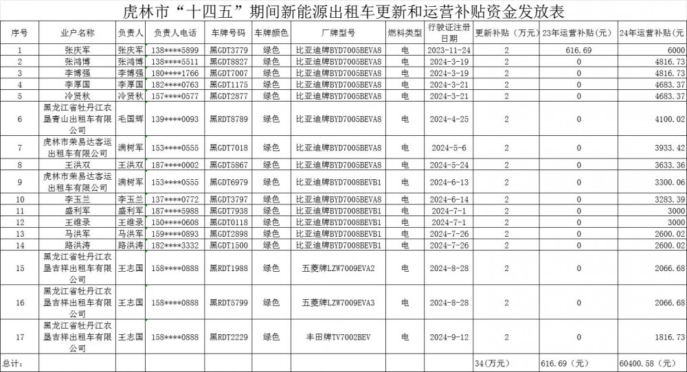 虎林市“十四五”期间新能源出租车更新和运营补贴资金发放表.xlsx
