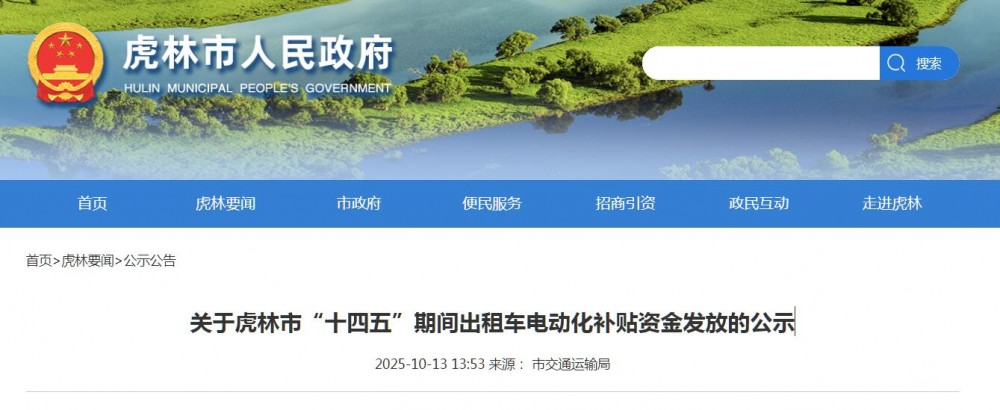 黑龙江虎林市“十四五”期间出租车电动化补贴资金发放公示
