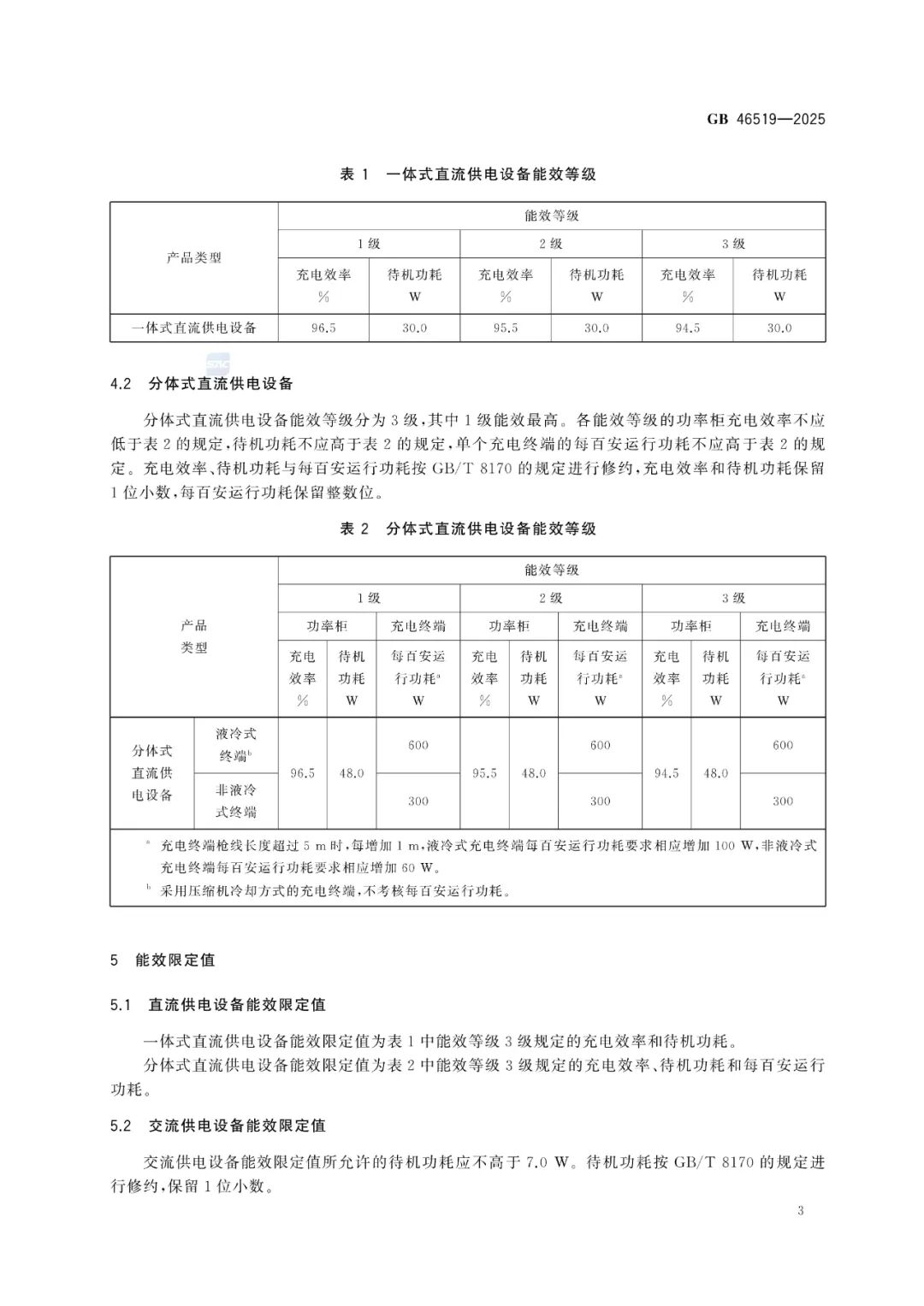 其中,直流供电设备分一体式与分体式,能效等级均为 3 级(1 级最高),分别规定充电效率、待机功耗等指标;交流供电设备限定待机功耗不超 7.0W。