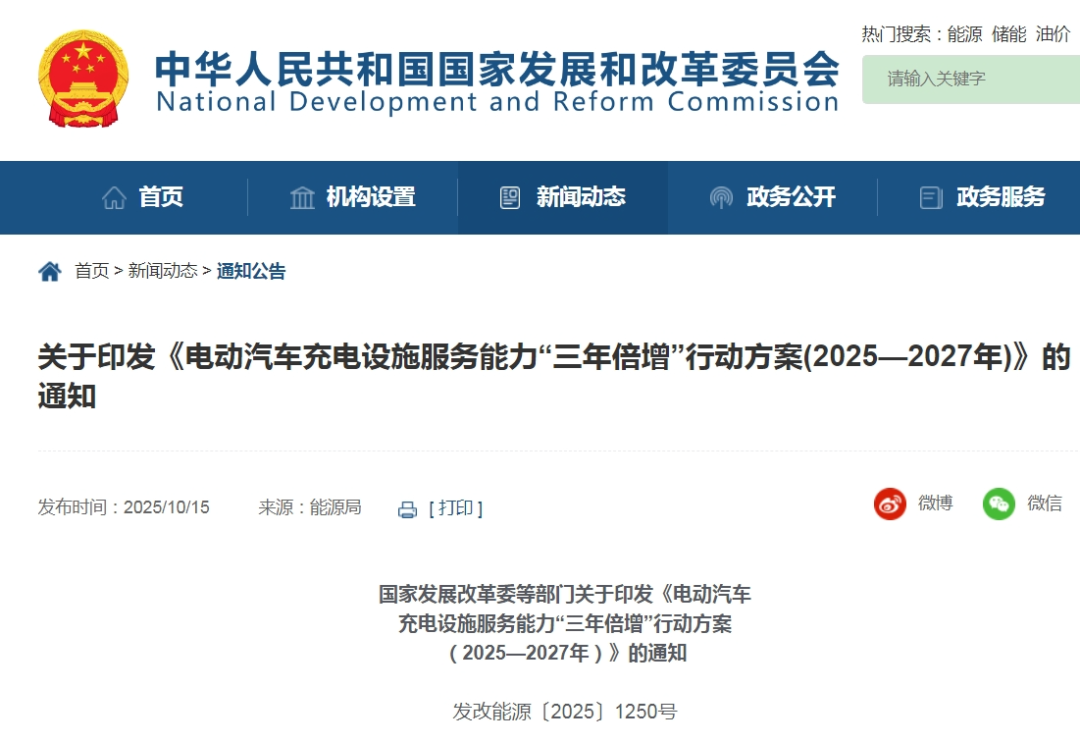 近日,国家发展改革委、国家能源局等六部委联合印发《电动汽车充电设施服务能力“三年倍增”行动方案(2025—2027年)》(发改能源〔2025〕1250号)(以下简称《行动方案》),明确提出到2027年底实现充电服务能力翻倍增长的战略目标。
