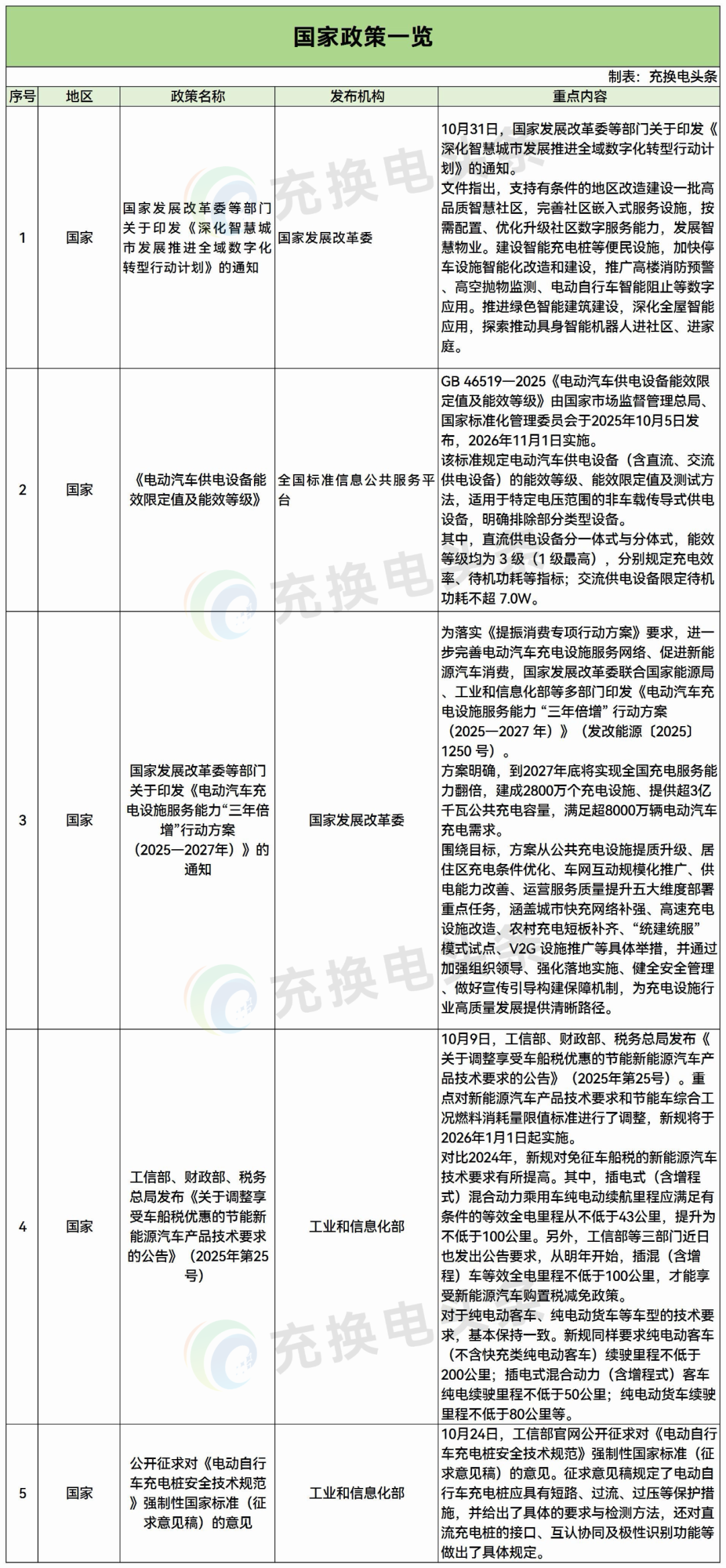 据充换电头条梳理统计,2025年10月国家及地方共发布新能源汽车及充换电相关政策31条。其中,国家出台政策5条,地方出台政策26条。